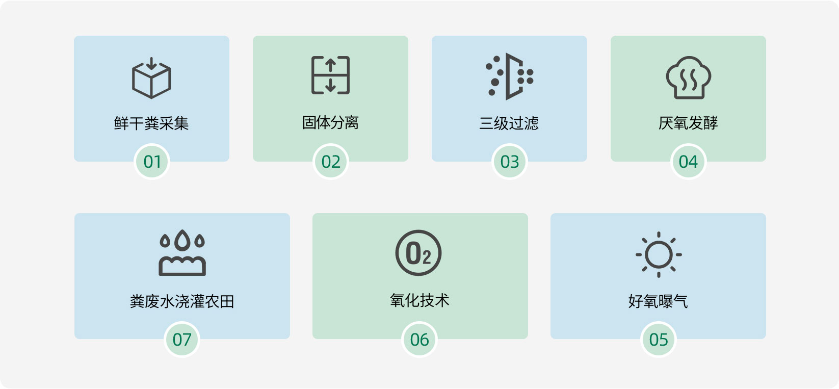 对污水通过厌氧、好氧等工艺处理后,出水水质达到国家排放标准,固体粪便通过堆肥等方式处理后,再利用。